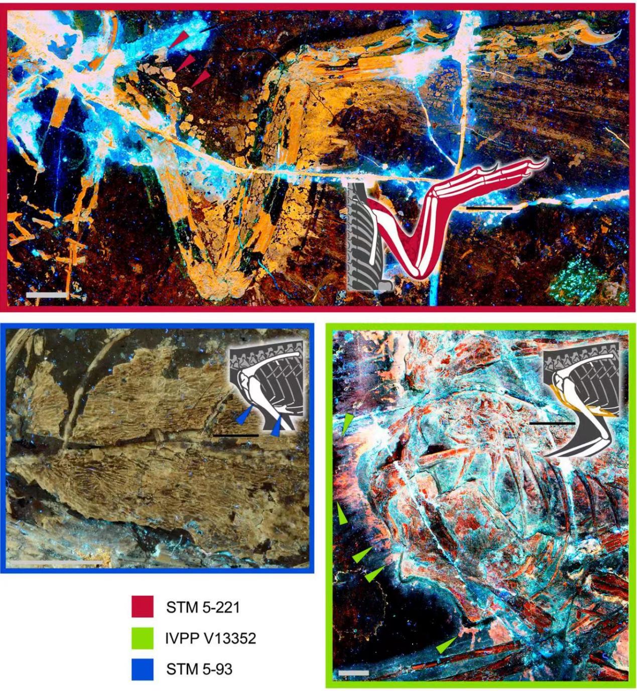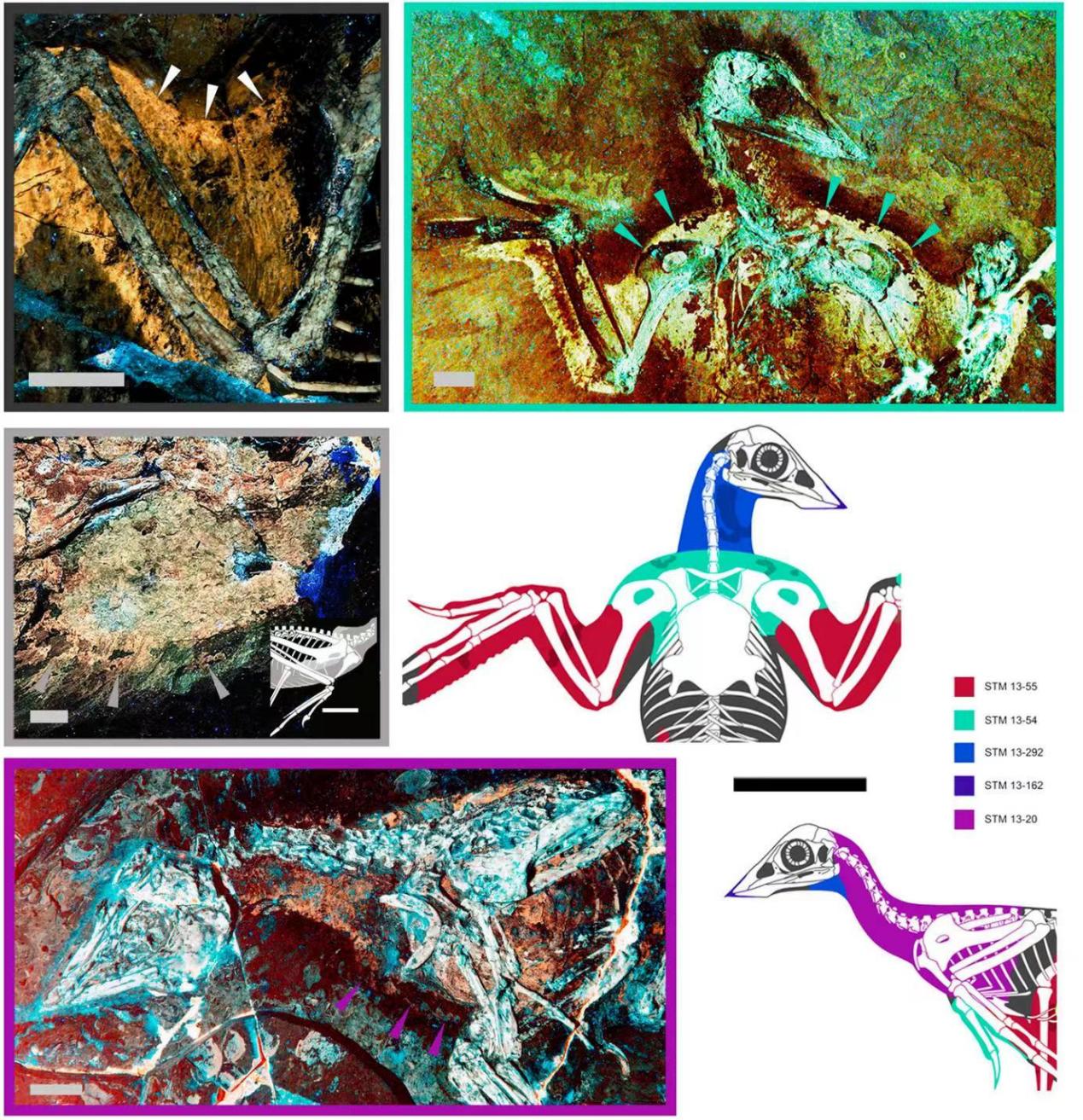 鸟类祖先的飞行系统,在上冲肌肉迁移到身体下面之前,分为肩部和胸部肌肉,背侧的三角肌和上胸肌控制上冲,胸前的胸肌控制下冲。了解现代飞行系统的起源,需要保存有不同肌肉的特点,但这很难在化石中保存。在这里,我们揭示了最早的飞行恐龙的软组织解剖结构,它被保存为覆盖身体和限定身体边缘的残留皮肤化学成分。这些数据提供了保存下来的软组织解剖学,独立验证了鸟类祖先的飞行系统。保存的身体软组织表明的早期孔子鸟具有沉重的肩部结构和较弱的胸部结构,发展了翅膀上冲增强的拍打飞行能力。早期分化的始祖鸟和近鸟龙纤细的身体腹侧轮廓表明,胸肌还很弱小。翅膀辅助的陆上奔跑的增加可能通过更高的呼吸要求加速了胸骨缩小。早期鸟类会鸟的下冲拍打飞行要求较低,可能是通过骨骼功能的适应来推动胸骨缩小,可能是受到类似孔子鸟的上冲程的高呼吸的需求。这两个因素都得到了纤细的腹面体型的支持。