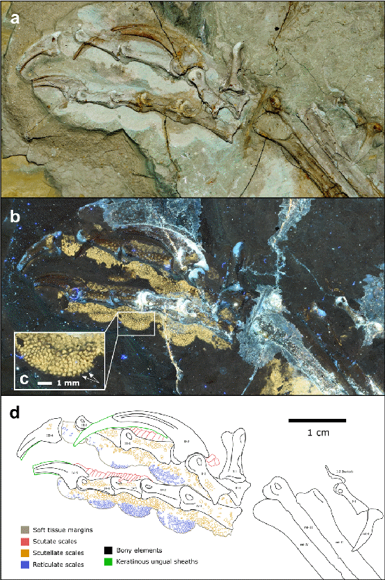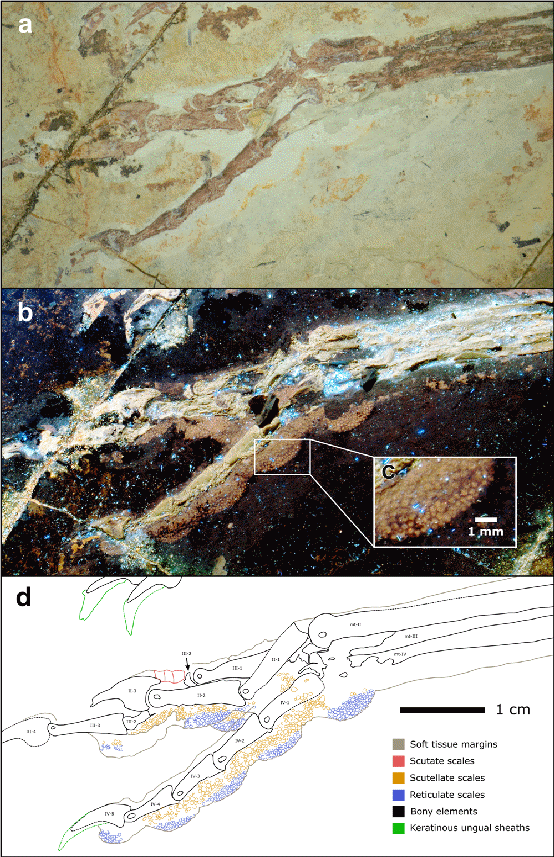 现代鸟类数量庞大、种类繁多,生态、生活方式也不尽相同,因而演化出各式各样的鸟爪(足部)来适应其生活需求,比如站立、行走、抓握、捕食、御敌等,但是早期鸟类的足部结构的起源和演化尚有许多疑问。鸟爪角质化的足垫/趾垫、足鳞的形态、足关节铰链及其形态和大小都能够影响其抓握、捕食等能力。毫无疑问,形态各异的鸟爪是由其祖先类型演化而来。项目组使用激光激发荧光技术(LSF),揭示了兽脚类(包括早期鸟类)囊括了小盗龙、近鸟龙及孔子鸟的足部结构特征,充分地辨识出了这些化石保存的残留鸟爪结构,如角质化的趾垫、足鳞及关节铰链等,这为我们认识早期鸟类适应不同生态生活提供了重要的化石证据。