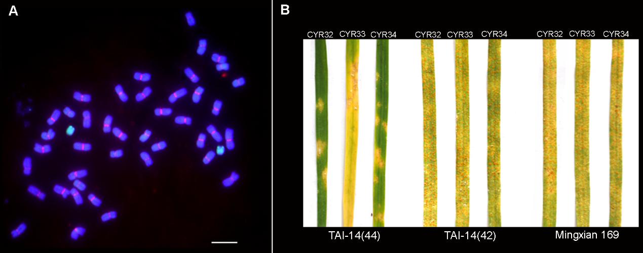 该研究利用国内优势条锈病生理小种CYR32、CYR33和CYR34对小麦-中间偃麦草异源附加系TAI-14接种鉴定时发现,当含有中间偃麦草外源染色体片段时,TAI-14(44)表现为高抗条锈病,而当外源片段丢失后,TAI-14(42)表现为高感条锈病,这表明在中间偃麦草外源染色体上存在一个抗条锈病位点,命名为YrT14(图1)。