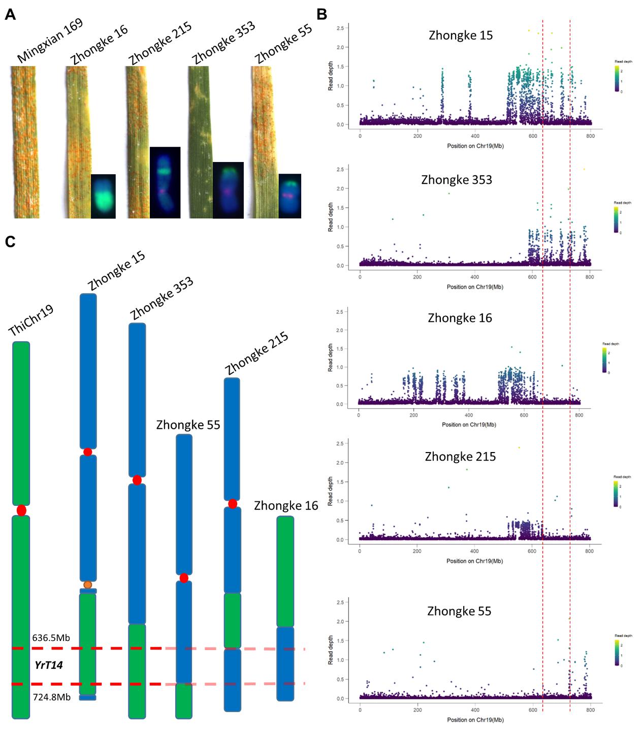 将易位系的表型与核型相结合,利用基因组重测序技术,将抗病基因初步定位在中间偃麦草19号染色体(7J或7Js)636.7 - 724.8 Mb的区里区段内(图3),为基因的进一步克隆奠定了坚实的基础。