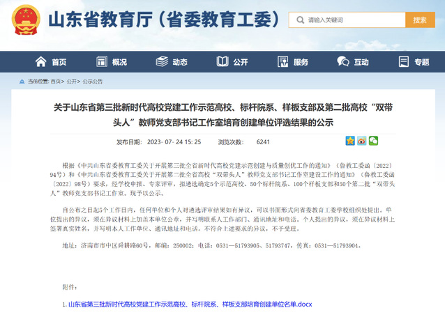 近日,省教育厅公示了山东省第三批新时代高校党建工作示范高校、标杆院系、样板支部及第二批高校“双带头人”教师党支部书记工作室培育创建单位评选名单。经学校申报、专家评审、结果公示,遴选确定5个示范高校、50个标杆院系、100个样板支部和50个第二批“双带头人”教师党支部书记工作室。我院生物技术教师党支部获批“新时代高校党建工作样板支部培育创建单位”,实现了生命科学学院创建省级党建品牌项目零的突破。