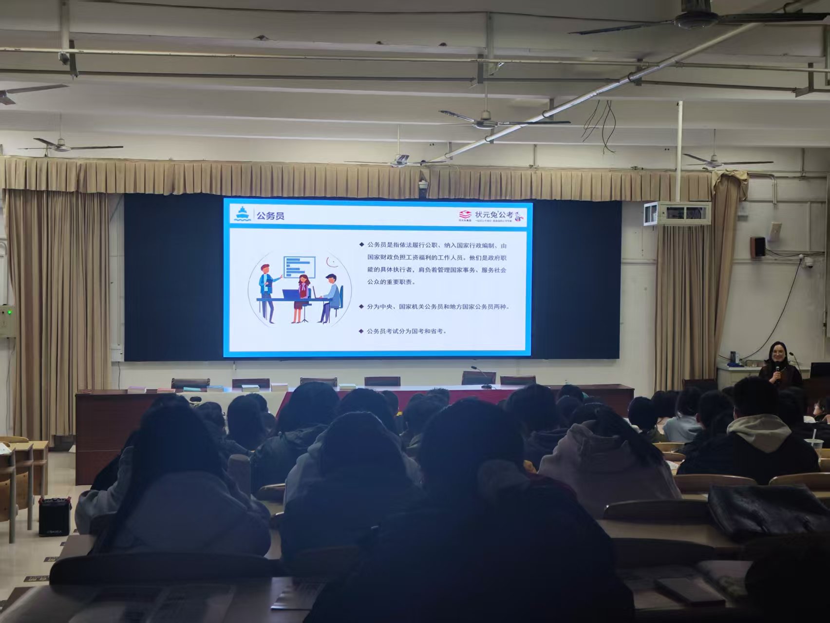 10月22日,状元兔公考专场讲座在学院明义6号楼502顺利开展。本次讲座聚焦近两年国家公务员考试核心要点,从就业形势、竞争格局、公务员核心价值及报考备考方法等维度,为在场学子带来全方位、深层次的公考指导。