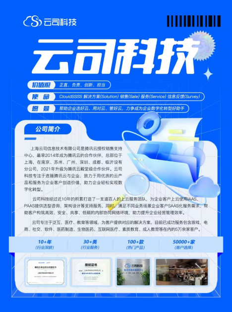 云司科技(上海云司信息技术有限公司)是腾讯云授权销售支持中心,2014年起成为腾讯云合作伙伴,2021年升级为腾讯云殿堂级合作伙伴,总部位于上海,在南京、苏州、广州等多城设有分公司。公司深耕云服务领域近10年,团队超百人,专注为企业提供IaaS、PaaS选型咨询、SaaS化服务等,已成功服务游戏、电商、生物医药、教育等领域5万余家客户,是企业数字化转型的优质助手。
